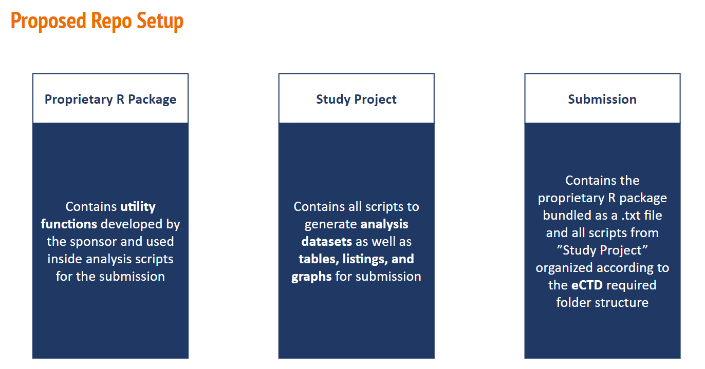 • For the most part Pilot3 will follow the same submission process as Pilot1, but the minor difference will just be our project flow. I.E., Pilot 3 will separate the Utility functions from the Project analysis scripts into different repos. It makes more sense to treat the study specific utility functions as separate package, similar to how we call on other R packages from CRAN or other git repositories, where then the project analysis repo scripts will call on the aforementioned study specific utility functions package. This is still in line with the R4CSR guidance in section 14.3